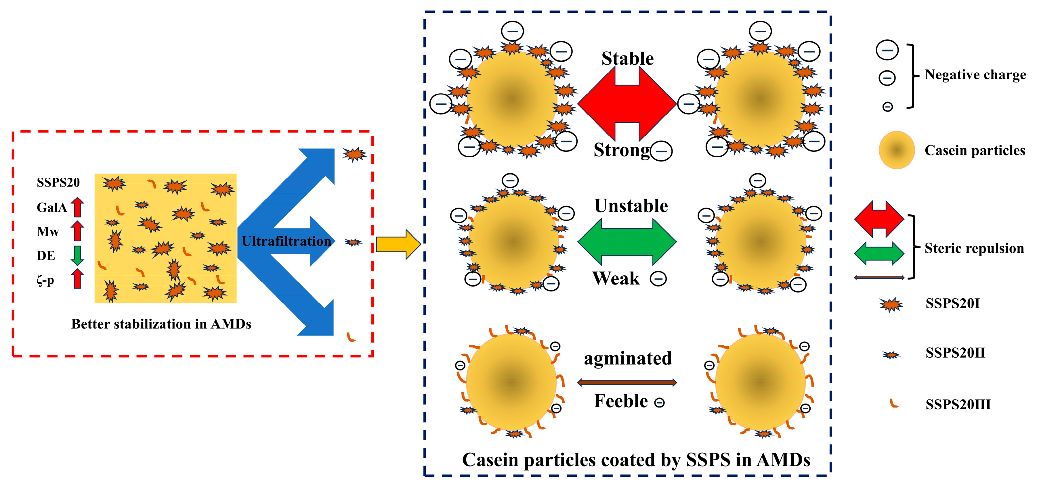 As illustrated in Figure 8, based on the compositional and structural differences among SSPS20I, SSPS20II, and SSPS20III, along with the results from physical stability analysis, it can be inferred that SSPS20I (characterized by a high MW and low DE) plays the most critical role in stabilizing AMDs. The stability of AMDs is highly dependent on both the DE and MW of the SSPS-based stabilizers. The negatively charged galacturonic acid backbone of SSPS adsorbs onto positively charged surface patches of casein particles, while neutral side chains composed of galactan and arabinan extend into the aqueous phase to form a thick hydrated layer. This configuration stabilizes the casein particles through combined electrostatic and steric repulsion forces [7]. Interestingly, the stabilization mechanism of SSPS shows remarkable similarity to that of pectin, a widely studied polysaccharide stabilizer. Investigations on pectin have revealed that below pH 5.0, electrostatically charged segments of the pectin chains adsorb onto positively charged surfaces of casein particles, while the neutral segments protrude into the aqueous phase to form extended loops. This configuration effectively impedes particle aggregation through steric hindrance, thereby enhancing colloidal stability of the system [26,27]. Similar results have also been reported for milk protein particles stabilized by water-soluble polysaccharides derived from peas [28].