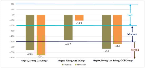 The matrix effect was evaluated using purification methods (MgSO4 150 mg + C18 25 mg, MgSO4 900 mg + C18 150 mg, and MgSO4 900 mg + C18 150 mg + GCB 20 mg) in which recoveries were within the acceptable range (Figure 1). Within these purification conditions, the method employing MgSO4 900 mg + C18 150 mg resulted in matrix effects classified within the soft or medium range, whereas the other methods exceeded the strong range [43].