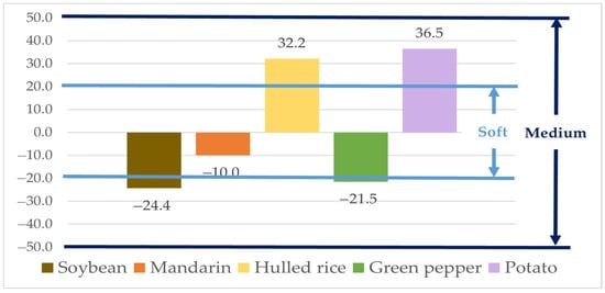 The matrix effects (MEs), based on the slopes of the calibration curves, were −24.4% for soybean, −10.0% for mandarin, 32.2% for hulled rice, −21.5% for green pepper, and 36.5% for potato (Figure 2). The ME for mandarin fell within the “soft” matrix effect range (|ME| < 20%), indicating negligible interference. The MEs for soybean, hulled rice, green pepper, and potato were classified as “medium” matrix effects (20% ≤ |ME| < 50%). Therefore, natamycin was quantified using the matrix-matched calibration curve for accurate determination [45].