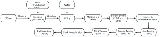 Medium-high temperature Daqu was produced following traditional manual methods at Yibin Nanxi Wine Industry Co. (Yibin, Sichuan, China) The process was as follows: wheat grains were conditioned by spraying with 3~5% boiling water (used for surface sterilization and improved water absorption), thoroughly mixed, and then piled for 2 h ± 0.5 h to allow uniform water penetration. The steeped wheat was crushed using a small roller crusher to achieve the desired state of a fragmented endosperm while preserving the pericarp integrity. The crushed material was mixed with 38% ± 2% water. The mixture was then molded into bricks (300 × 190 × 80 mm3) within a frame by compaction. The raw Qu bricks were air-dried at 25 °C until the surface became non-sticky (surface drying for approximately 1.5–2 h). All batches subsequently underwent a 25-day fermentation period in the same room with three turnings on days 7, 14, and 21 (Figure 1).
