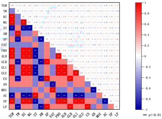 Physicochemical correlation between quality of Daqu and wheat. ** p < 0.01. Abbreviations: TGW: Wheat thousand grain weight; TW: Wheat test weight; HI: Wheat hardness index; WG: Wheat wet gluten content; ST: Total starch content; AM: Amylose content; AP: Amylopectin content; FAT: Fat content; PRO: Wheat total protein content; ALB: Albumin content; GLB: Globulin content; GLI: Gliadin content; GLU: Glutenin content; CS: Daqu comprehensive score; AN: Daqu amino acid nitrogen; MOI: Daqu moisture content; AC: Daqu acidity; SP: Daqu saccharification power; LP: Daqu liquefaction power.