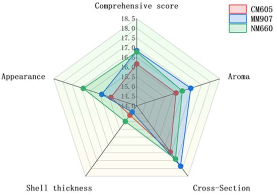 The sensory evaluation profiles of Daqu produced from the three wheat varieties are presented in Figure 3. All Daqu types met the standard for second-grade classification. The radar chart illustrates distinct sensory profiles associated with each variety. NM660-Daqu was characterized by its superior performance in appearance and crust thickness, a critical quality attribute as the Daqu surface serves as the primary site for diverse microbial colonization and enzymatic activity. MM907-Daqu achieved the highest comprehensive score, leading in aroma and also performing well in cross-section evaluation. CM605-Daqu, while meeting the grade standard, received a comparatively lower comprehensive score. These observed sensory differences can be attributed to the physicochemical properties of the raw wheat materials. The higher hardness and gluten content of NM660 wheat likely contributed to the formation of a physical structure more conducive to microbial growth during Daqu-making [34], consistent with its superior scores in appearance and crust thickness. For a detailed statistical analysis of significant differences between varieties for each attribute, please refer to Supplementary Table S1.