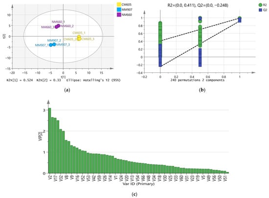 PLS-DA analysis of the volatile substances in Daqu. (a) Plot of PLS-DA scores; (b) Plot of substitution tests; (c) Plot of VIP scores.