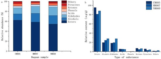 Volatile sµbstance content of Daqu proportion of different volatile compounds (a); relative content of various volatile compounds (b).