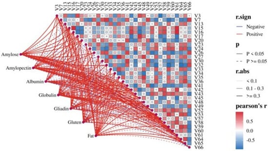 To quantitatively reveal the associations between major wheat components and the aforementioned key differential volatile compounds, Mantel Test correlation analysis was performed (Figure 6). The results showed: amylose showed positive correlations with 27 differential volatiles, including 16 significant positive correlations (e.g., 2-butanol, 2,5-dimethylpyrazine, ethyl butyrate; p < 0.05). Amylopectin showed positive correlations with 26 volatiles, including 16 significant positive correlations (e.g., n-amyl alcohol, isovaleric acid, propyl acetate; p < 0.05). Among the protein components, globulin showed the strongest positive correlations with volatiles (25 positive correlations, 17 of which were significant, e.g., hexanoic acid, 3-methylpentanoic acid, benzyl alcohol; p < 0.05), while the non-gluten protein albumin showed fewer positive correlations (20, 12 significant). Gluten proteins (gliadin and glutenin) exhibited similar correlation patterns with volatiles. Despite its lower abundance in wheat, fat showed positive correlations with 30 differential volatiles (16 of which were significantly positive, e.g., isobutanol, 2-furaldehyde, hexanal; p < 0.05), indicating its significant influence on the formation of flavor compounds in Daqu.