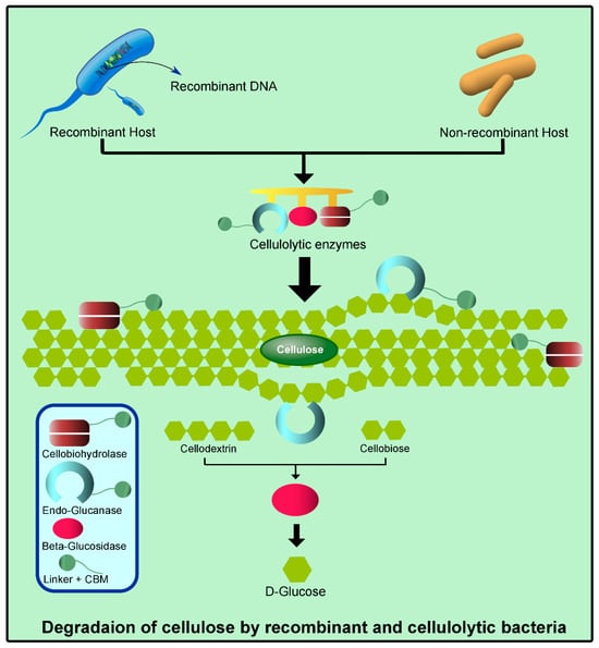 Recent advances in annotation systems for cellulose-active enzymes have improved the process of assigning functions to newly identified cellulases. As these conserved enzymes within CAZy families operate harmoniously in a tailored cascade, which empowers them to overcome the structural complexity of food processing waste. According to the CAZy database, the members of all three cellulase classes (endoglucanases, exoglucanases, and β-glucosidases) belong to different glycoside hydrolase (GH) families. Their classification is prepared based on the depolymerization stage of the targeting substrate [16]. According to the cellulase structure and sequence of amino acids, the catalytic modules are categorized into distinct hydrolase families. CD sub-classification is attributed to various complex, fold-oriented structures (lectin-like β-sandwich, 8-barrel, and 6-barrel type) and amino acid sequences [17]. However, structure-based classification categorizes catalytic domains into 15 of more than 80 known GH families during the 1990s [18]. These families are 5/A, 6/B, 7/C, 8/D, 9/E, 10/F, 11/G, 12/H, 26/I, 44/J, 45/K, 48/L, 51, 60, and 61. Furthermore, β-amylases and glucoamylases are classified in families 14 and 15, respectively. On the contrary, the CBMs consist of 30–180 amino acid residues, which exist as a single, double, or triple domain in one protein. CBMs can be classified into types: Type A, B, and C. Type A CBM has been assigned a function to recognize the crystalline polysaccharides and bind to them. Type B CBMs bind the internal glycan chain. These binding sites appear as extended clefts comprising binding subsites to accommodate long sugar chains. Type C CBMs bind to short oligosaccharides externally via pocket-shaped binding sites [19]. In the past five years, fifteen new families of CBMs have been discovered. More so, other kinds of auxiliary proteins, like lytic polysaccharide monooxygenase, assist in the oxidative cleavage of the crystalline cellulose bond, which enormously improves the cellulase efficiency against recalcitrant waste streams. These enzymes can be produced by naturally cellulolytic isolates (belonging to Thermobifida, Trichoderma, and Pseudomonas) and engineered microbial systems (Escherichia and Bacillus) as illustrated by Figure 1, maximizing the opportunity to turn the problem of managing cellulose-rich food processing waste into useful bioproducts.