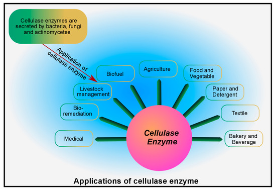Cellulose is the most abundant and cost-effective renewable energy resource with an estimated annual biomass production of around 1.5 × 1012 tons globally [86]. It is the main polysaccharide of food processing waste, and its conversion to glucose requires cellulase enzymes. Cellulases have been commercially available for over 30 years and are now coupled with fermentation engineering to convert cellulosic biomass into novel bio-products at a commercial scale. These cellulases are being used in various industries around the globe, such as food (as functional additives), biofuels (for the production of bioethanol and biogas), agriculture, textiles, laundry, chiral separation, ligand binding, and waste management, as shown in Figure 3 and Table S1 [87].