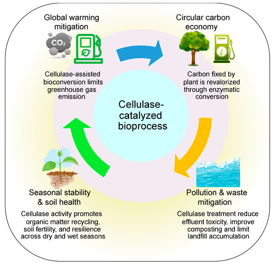 Beyond the reduction of carbon emissions, cellulase enzymes preserve the environmental balance throughout the seasons. The hydrolytic ability of cellulase promotes bioremediation and composting, which further results in reduced open-field burning, increases the breakdown of lignocellulosic wastes, controls air pollution, and decreases biomass accumulation during dry seasons. The biomass waste, which is associated with off-flavor, is predominantly reduced by cellulase activity, and it also minimizes eutrophication risks in aquatic ecosystems during wet seasons by preventing anaerobic putrefaction and stabilizing organic matter [130,131].