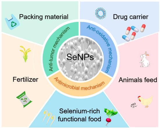 As a new type of nanomaterial, SeNPs show great potential and practical significance in many fields owing to their distinctive physicochemical characteristics and biological activities. This work summarizes and reviews the synthesis methods of SeNPs, their functional activity mechanisms, and their applications in packaging materials, functional foods, fertilizers, animal feed, and as drug carriers. In addition to integrating into the existing literature, this review also provides forward-looking perspectives on the current challenges related to toxicity, long-term stability, scalable production, and regulatory barriers. We aim to pave the way for the rational design and further utilization of SeNPs by highlighting these underexplored yet critical aspects.