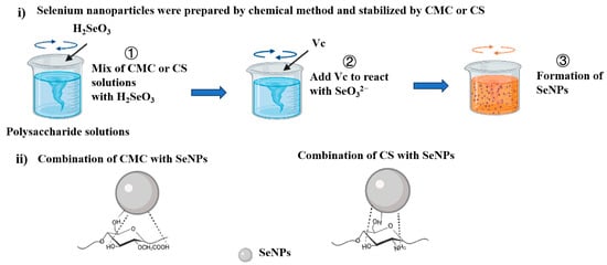 Typical chemical method for the preparation of SeNPs. Schematic representation of SeNPs binding to polysaccharides, adapted with permission from the copyright 2022, Elsevier [40].