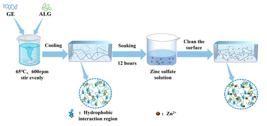 To prepare zinc-loaded hydrogels, GE-ALG hydrogels were carefully trimmed into cylindrical shapes with a height of 10 mm and a diameter of 20 mm. These trimmed hydrogels were subsequently immersed in 15 mL zinc sulfate solutions with concentrations of 5 wt%, 15 wt%, and 25 wt% for 12 h to facilitate Zn2+ loading. The surface of each zinc-loaded hydrogel was rinsed three times with deionized water to remove any unbound ions after immersion. Finally, these hydrogels were stored at 4 °C for 12 h to ensure complete stabilization for subsequent testing. For the convenience of subsequent discussions, GE-ALG hydrogels at different gelatin-to-sodium alginate ratios and zinc-loaded hydrogels were abbreviated as xGE-yALG and xGE-yALG-z, where x, y, and z represent the concentrations of gelatin, sodium alginate, and zinc sulfate solutions, respectively. The schematic representation of the hydrogel preparation process and the formula of each hydrogel are shown in Figure 1 and Table 1, respectively.
