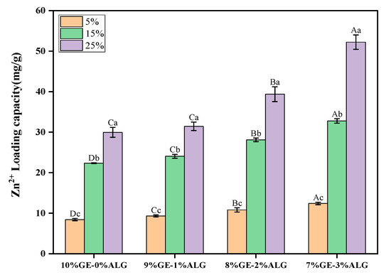 Zinc loading capacity of different hydrogels. 10%GE-0%ALG, 9%GE-1%ALG, 8%GE-2%ALG, 7%GE-3%ALG represent that the ratio of gelatin to sodium alginate in the hydrogel is 10:0, 9:1, 8:2, and 7:3, respectively; 5%, 15%, 25% represent the concentrations of zinc sulfate solution. Different uppercase letters indicate significant differences between groups, while different lowercase letters indicate significant differences within groups.