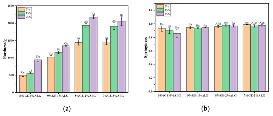 Texture profile of different zinc-loaded hydrogels. (a) Hardness and (b) springiness. 10%GE-0%ALG, 9%GE-1%ALG, 8%GE-2%ALG, and 7%GE-3%ALG represent that the ratio of gelatin to sodium alginate in the hydrogel is 10:0, 9:1, 8:2, and 7:3, respectively; 5%, 15%, 25% represent the concentration of zinc sulfate solution. Different uppercase letters indicate significant differences between groups, while different lowercase letters indicate significant differences within groups.