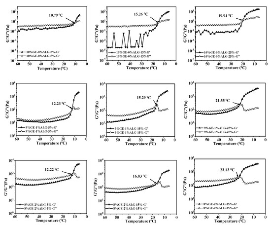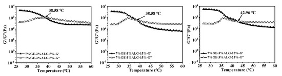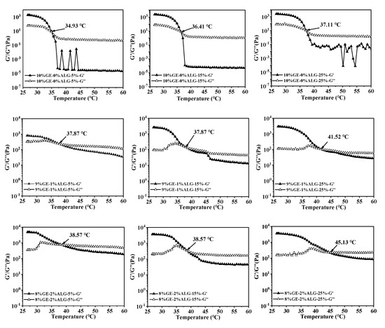 When the temperature drops, the increased G′ and G″ will come to an intersection, and the intersection point is defined as the gelling temperature of hydrogels, at which the hydrogel changes from a liquid state to a solid-like gel state. Figure 6 shows that as the concentration of zinc sulfate increased, the gelling temperature of all hydrogels gradually increased, suggesting that the presence of zinc sulfate enables gelatin solution and gelatin-sodium alginate solution to form a hydrogel at higher temperatures. The specific values of the gelling temperature are shown in Table 2. According to Qiao et al. [27], the gelling temperature of hydrogels increases linearly with the hydration entropy of anions in the aqueous solution. Strong hydration of SO42− polarizes water molecules in the first hydration layer of gelatin, resulting in the dehydration of hydrophilic biopolymers, causing the binding of individual polymer chains and promoting the gelation of gelatin solution. Additionally, the gelling temperature also increased after introducing sodium alginate, with the highest gelling temperature of 23.13 °C observed for the 8%GE-2%ALG-25% hydrogel. This also indicated that when gelatin and sodium alginate are in an appropriate proportion, the interaction between gelatin and sodium alginate, as well as the presence of zinc sulfate are conducive to the formation of the hydrogel structure.