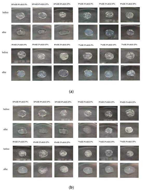 First, gelatin and sodium alginate powder were weighed separately, followed by adding a predetermined volume of deionized water for mixing. The mixture was then heated and stirred in a magnetic stirring water bath (SHJ-6AB, Changzhou Jintan Liangyou Instrument Co., Ltd., Changzhou, China) at 65 °C for over 60 min to ensure the complete dissolution and homogeneous mixing of the components. Subsequently, the solution was centrifuged at 4000 rpm for 10 min to eliminate any entrapped air bubbles. Finally, the solution was poured into cylindrical molds with a diameter of 20 mm and stored in a refrigerator at 4 °C for 12 h to obtain GE-ALG hydrogels with different ratios of gelatin to sodium alginate (GE:ALG = 10:0, 9:1, 8:2, 7:3).