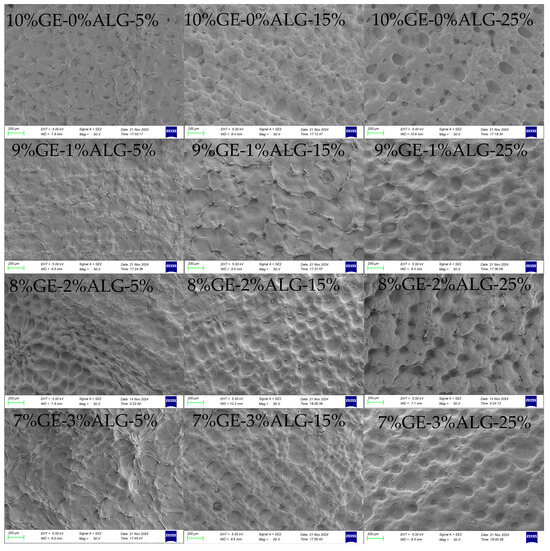 The microstructure of hydrogels is closely related to their macroscopic physical properties [19]. As shown in Figure 8, all zinc-loaded hydrogels exhibited a dense porous crosslinked structure. When the concentration of zinc sulfate solution increased, the porous structure of all hydrogels became more obvious and the pores deepened. This might be because the high concentration of zinc sulfate solution induced the formation of denser crosslinking in the hydrogel [15]. After introducing sodium alginate, no obvious change was observed in the microscopic morphology of hydrogels except for in the 8%GE-2%ALG-25% hydrogel. The morphology of the 8%GE-2%ALG-25% hydrogel displayed larger and deeper honeycomb-like pore structures compared with other hydrogels, which might be the reason for the high hardness and G′ of the 8%GE-2%ALG-25% hydrogel.