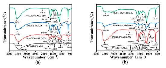 As shown in Figure 9b–d, significant changes were observed in the xGE-yALG hydrogels. Specifically, the peak at 3457.57 cm−1 shifted to 3464.03 cm−1, 3644.51 cm−1, and 3465.46 cm−1 in the 9%GE-1%ALG hydrogel, 8%GE-2%ALG hydrogel, and 7%GE-3%ALG hydrogel, suggesting the formation of hydrogen bonds between the hydroxyl groups of sodium alginate and the amino groups of gelatin [36]. Additionally, the amide I band peak at 1643.63 cm−1 shifted to 1677.98 cm−1, 1666.05 cm−1 and 1658.97 cm−1, and a new peak appeared at 1535.39 cm−1, 1544.42 cm−1 and 1534.28 cm−1 in the 9%GE-1%ALG hydrogel, 8%GE-2%ALG hydrogel, and 7%GE-3%ALG hydrogel, corresponding to the amide II band. These shifts indicated potential electrostatic interactions between the positively charged amino acid residues in gelatin and the negatively charged carboxyl groups in sodium alginate [37].