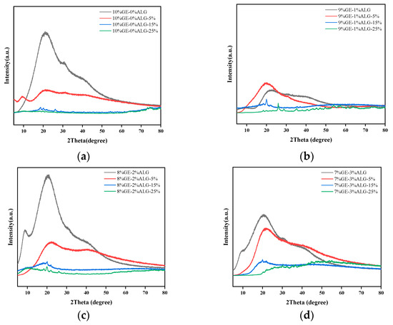 After incorporating sodium alginate, the intensity of the characteristic peak of xGE-yALG hydrogels decreased slightly, as shown in Figure 10b–d. This reduction is likely due to electrostatic interactions between the carboxyl groups of sodium alginate and the amino groups of gelatin, which interfere with the amorphous structure to a certain extent [37]. Notably, after adding sodium alginate, a new diffraction peak appeared in the xGE-yALG hydrogels near 2θ = 9°, indicating that a regular crystal structure appeared in the xGE-yALG hydrogels [11], which may be the reason why the hardness and the melting temperature of hydrogels containing sodium alginate are higher than that of hydrogels without sodium alginate. After loading Zn2+ through the zinc sulfate solution soaking method, the intensity of the diffraction peak at 20° also decreased sharply in xGE-yALG hydrogels, especially when the concentration of zinc sulfate solution was 15 wt% and 25 wt%, which may be related the SO42−-enhanced hydrophobic interaction and the binding of Zn2+ to the hydrogel matrix. In addition, the diffraction peak of the 8%GE-2%ALG-25% hydrogel completely disappeared at 2θ = 20°, while an obvious diffraction peak appeared at 2θ = 9°, which corresponds to the crystal structure of the 8%GE-2%ALG-25% hydrogel, and also exactly corresponds to the relatively stable gel structure of the 8%GE-2%ALG-25% hydrogel.
