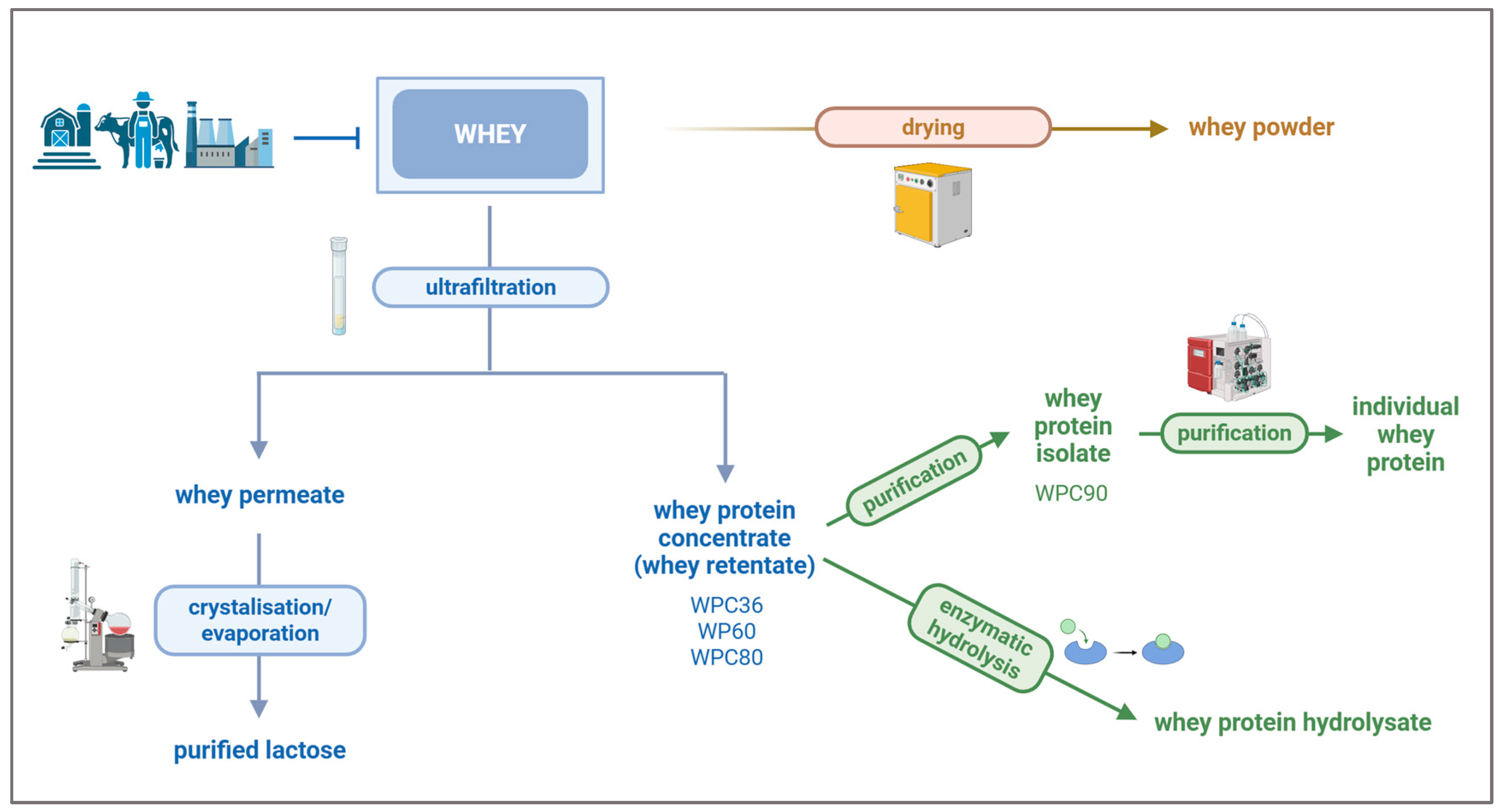 - Guo, M.; Wang, G. Chapter1 History of Whey Production and Whey Protein Manufacturing. In Whey Protein Production Chemistry, Functionality, and Applications; Guo, M., Ed.; John Wiley & Sons Ltd.: Hoboken, NJ, USA, 2019; pp. 1–12. [Google Scholar]
