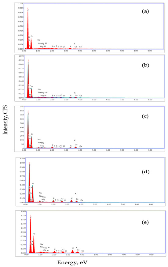 The morphology of the BP powder and obtained stirred yogurts and their elemental composition were characterized with a scanning electron microscope (SEM) (Quanta 450, FEI, Thermo Fisher Scientific, Hillsboro, OR, USA) and an energy-dispersive X-ray detector (EDS) (EDAX, AMETEK Inc., Berwyn, PA, USA). Prior to analysis, calibration was carried out using a standard AlCu sample, which consisted of copper foil mounted on an aluminum grid. The EDS spectra analysis was performed using the TEAM version V4.1 system from EDAX Inc. (Mahwah, NJ, USA). Each of the samples were analyzed under low-vacuum circumstances, with a pressure of roughly 6.1 × 10−4 Pa, an electron acceleration voltage of 15 kV, and a 500× (50 μm) magnification.