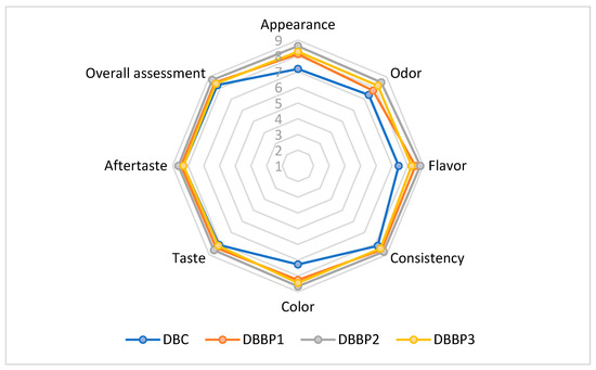 In addition, the enrichment of stirred yogurt with BP led to a moisture decrease, which was followed by increases in protein, fat, fiber, carbohydrates, ash, and total dry matter as the level of BP addition increased. This occurred because the incorporation of BP increased the proportion of solid components in the yogurt formulation, thereby reducing the relative water content and concentrating other nutrients such as proteins, lipids, fiber, carbohydrates, ash, and total dry matter. The significant levels of dietary fiber and crude protein in BP powder may account for these results [46,52].