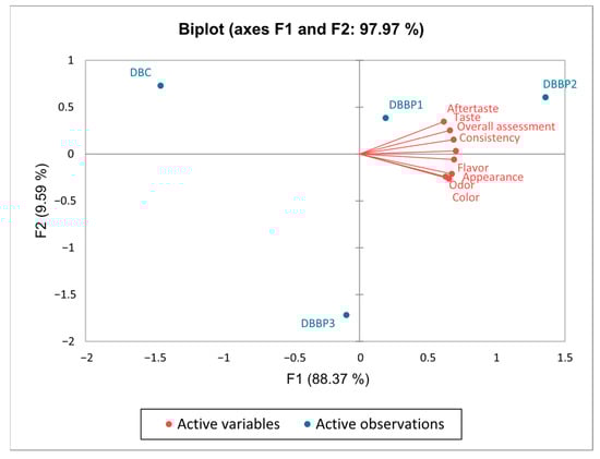 The results were presented in triplicate as the mean ± standard deviation (SD) for each sample. Statistical differences among the all samples were analyzed using Minitab 19.0 (free trial). When significant differences were observed, one-way analysis of variance (ANOVA) followed by Tukey’s test with a 95% confidence interval was applied. Principal component analysis (PCA) was performed on the descriptive sensory data using XLSTAT, an add-in software for Microsoft Office Excel (Trial Version 2024, Addinsoft, Paris, France).