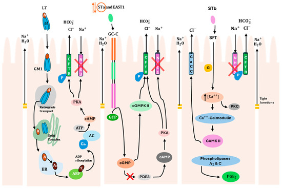 Escherichia coli is typically a harmless commensal microorganism; however, through the acquisition of diverse genetic elements, it can evolve into a highly adapted and virulent pathogen. Pathogenic E. coli can lead to a range of diseases in the host, ranging from gastroenteritis to extraintestinal infections affecting the urinary tract, bloodstream, and central nervous system [1]. These diseases may affect either animals or humans worldwide and comprise two main classes of pathovars: diarrheagenic E. coli and extraintestinal E. coli [2]. The following six pathovars are classified as diarrheagenic: enteropathogenic E. coli (EPEC), enterohaemorrhagic E. coli (EHEC), enterotoxigenic E. coli (ETEC), enteroinvasive E. coli (EIEC), enteroaggregative E. coli (EAEC), and diffusely adherent E. coli (DAEC). Of particular importance is the Shiga toxin–producing E. coli (STEC) pathotype, which largely overlaps with EHEC. Cattle serve as its major reservoir and represent the primary source of human foodborne outbreaks associated with this pathogen [3]. While uropathogenic E. coli (UPEC) and neonatal meningitis E. coli (NMEC) are the two most common pathovars within the extraintestinal E. coli-associated infections [1], it is important to mention that other pathovars have been recognized, but their mechanisms of pathogenicity are not well established. Additionally, several virulence strategies are shared among distinct E. coli pathovars, such as adhesion to host cells achieved through fimbriae or pili (with the exception of the EIEC pathovar), followed by the disruption of host cell processes. Although each pathovar has its typical processes of attaching to and exploiting host cells [1], the present study focuses on ETEC, highlighting its virulence mechanisms and the physiological alterations induced by the enterotoxins produced in humans and pigs.