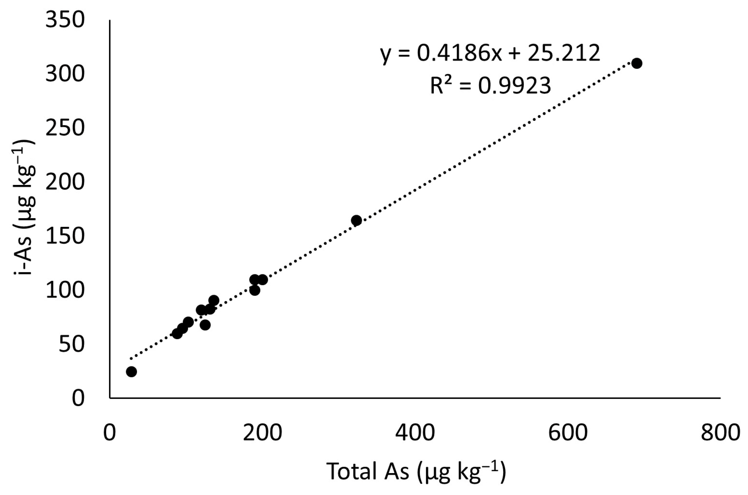 The relationship between t-As and iAs was analyzed using simple linear regression to derive a predictive equation. Statistical analysis was performed using Microsoft Excel, and the goodness-of-fit of the regression model was evaluated using the coefficient of determination (R2). A significance level of p < 0.05 was considered for all statistical tests. The regression equation can be seen in Figure 1.