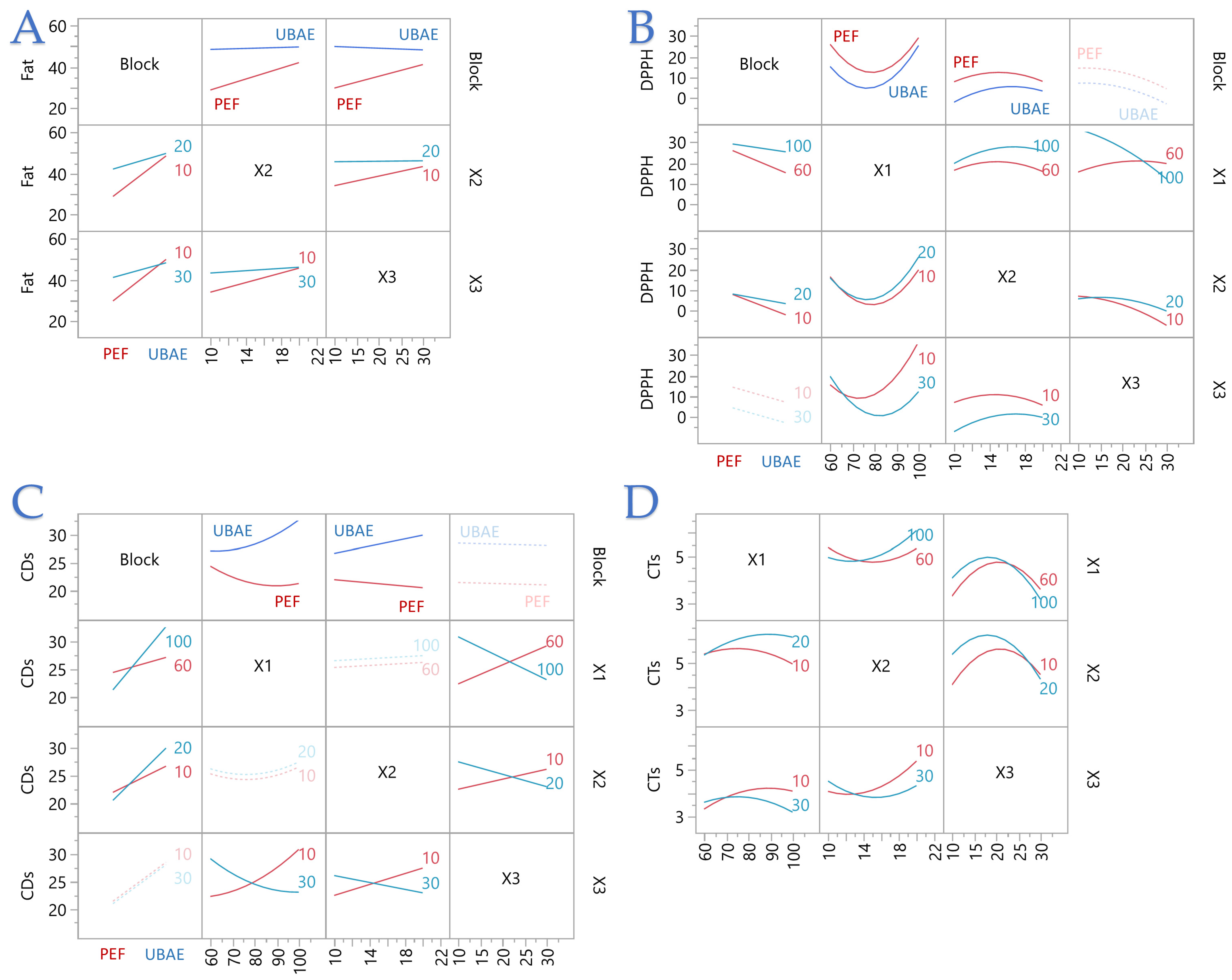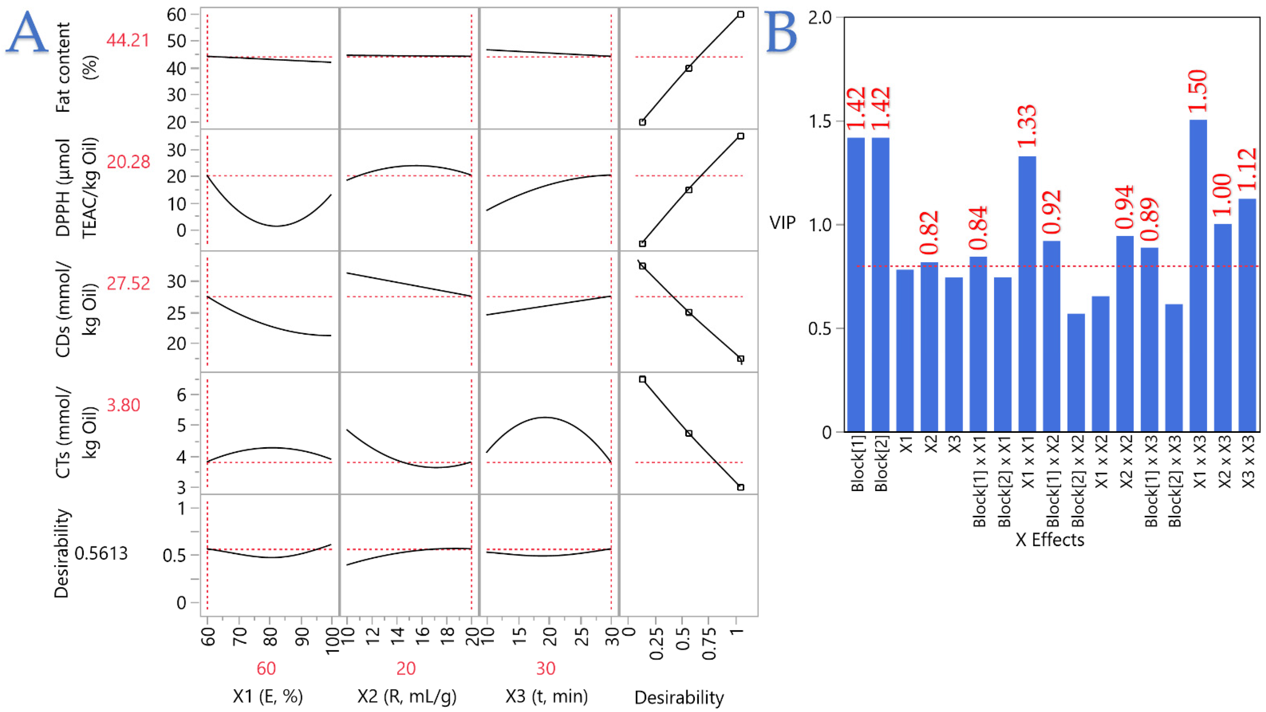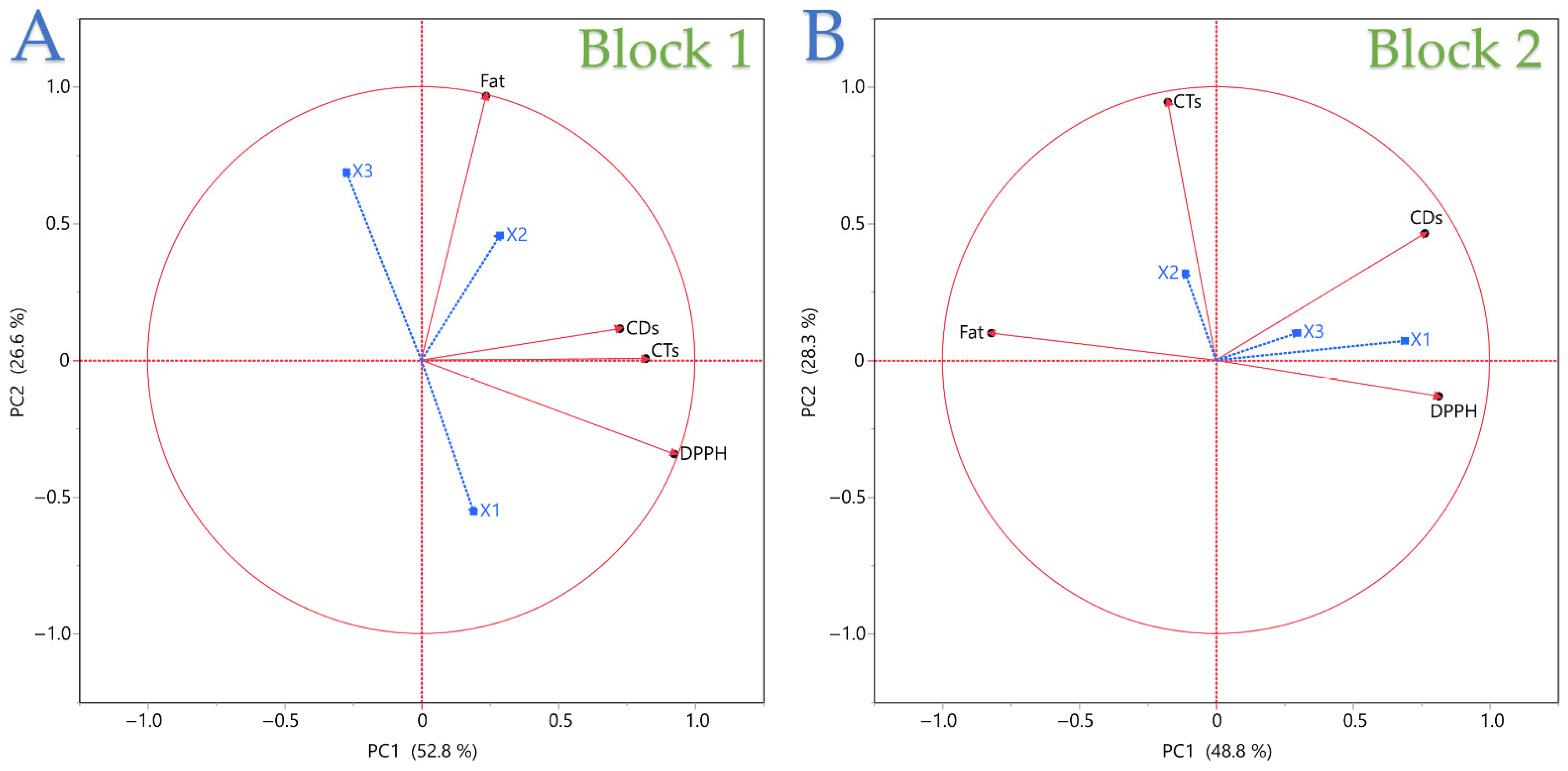 | Block (Technique) | X1 (E, %) | X2 (R, mL/g) | X3 (t, min) | Fat | DPPH | CDs | CTs | |