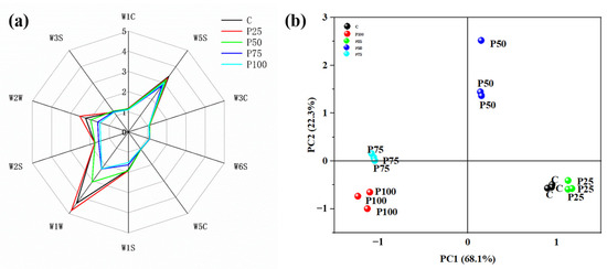 The radar plot shown in Figure 2a demonstrates the response intensity of various sensors to the volatile compounds in different pork patties. Compared to sensors W1C, W3C, W6S, W5C, and W3S, sensors W5S, W1W, W2W, W1S, and W2S exhibited significantly enhanced and distinctive responses to the pork patties, indicating that the pork patties may contain higher concentrations of sulfur compounds, alcohols, aldehydes, ketones, and aromatic compounds. The meaning of indicators such as W1C is shown in Table 6. Compared with the control group, the replacement group of P25 exhibited relatively high response values on sensors W1W, W2W, and W1S, indicating that P25 pork patties may contain more abundant sulfur compounds and aromatic compounds, which play crucial roles in flavor formation. The heightened response of sensors W1W and W1S, indicating sulfur and aromatic compounds, aligns with the known flavor profile of mushrooms as reported by Selli et al. [34].