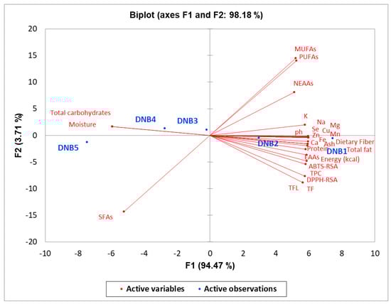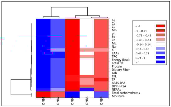 Interestingly, the principal component analysis (PCA) of all measured variables is clearly presented for DNB1–DNB5 in Figure 2. The first two principal components explained 98.18% of total variance, with PC1 accounting for 94.47% and PC2 for 3.71%, indicating a dominant pattern of systematic variation among formulations. Samples showed clear separation along PC1 in a gradient pattern from DNB1 to DNB5. Hierarchical clustering grouped DNB1-DNB2 as nutrient-dense formulations and DNB4-DNB5 as lower nutrient-density samples (Figure 3). Minerals (Se, Zn, P, Mn, Ca, Cu, Fe, Mg, Na), macronutrients (protein, total fat, energy, dietary fiber), and bioactive compounds (TPC, DPPH-RSA, ABTS-RSA, TF, TFL) showed strong positive associations with PC1. In contrast, moisture and total carbohydrates were negatively associated. EAAs, MUFAs, and PUFAs also contributed positively to PC1. The heatmap with hierarchical clustering revealed tight co-variation among minerals and antioxidant compounds, indicating coherent nutritional patterns across formulations. The systematic gradient reflects a compositional trade-off between nutrient density and straightforward carbohydrate content, with DNB1 representing the most nutrient-dense formulation (Figure 3).