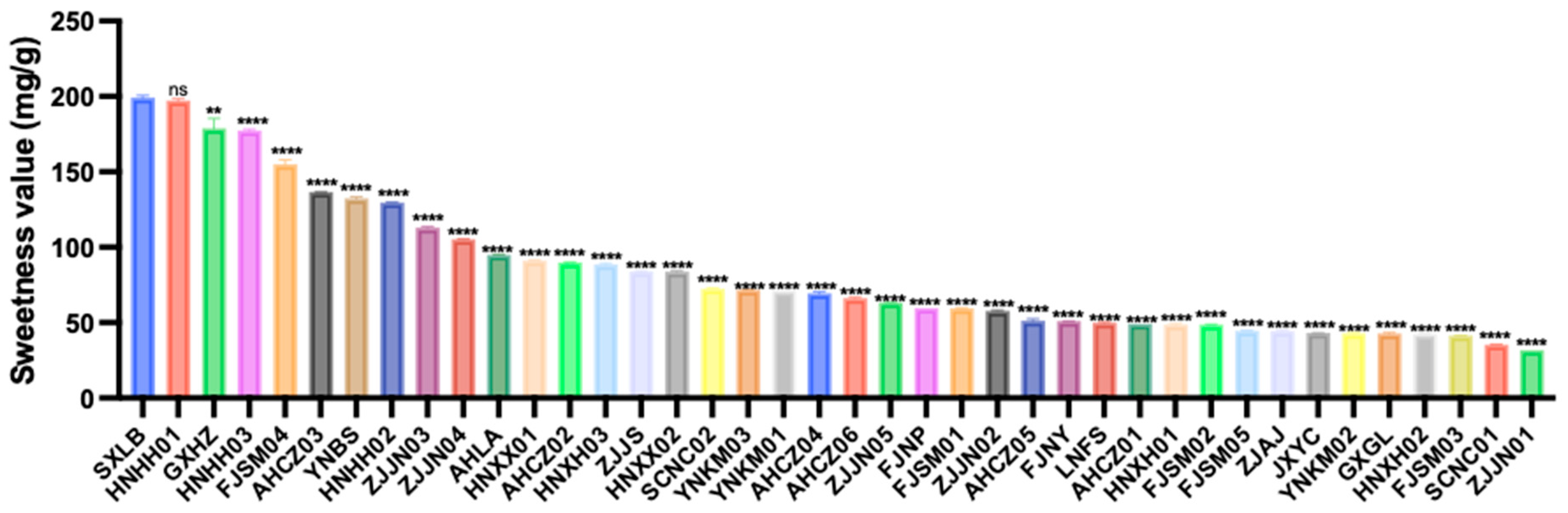 3.1. Sweetness Evaluation and Polysaccharide Content of Polygonatum Germplasms