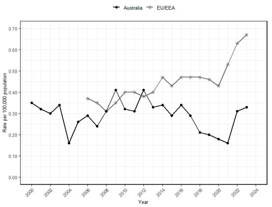 Annual listeriosis incidence rates per 100,000 population in the European Union and European Economic Area (EU/EEA) and Australia. The surveillance data of Australia (2000–2023) was obtained from the National Notifiable Diseases Surveillance System (NNDSS) database [8,77,78], and annual population estimates were extracted from Australian Bureau of Statistic [79]. The listeriosis rates for the EU/EEA were obtained from the European Centre for Disease Prevention and Control’s (ECDC) Annual Epidemiological Reports. Starting in 2020, the rate from the United Kingdom was excluded from this report [10,80,81,82,83,84,85,86,87,88,89,90,91,92,93].