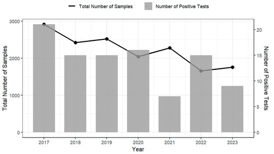 Annual testing results of imported RTE foods for L. monocytogenes by the Australian Department of Agriculture, Fisheries and Forestry between 2017 and 2023 [22]. The left y-axis and black line represent the total number of samples tested each year; the right y-axis and grey bars represent the number of samples positive for L. monocytogenes.