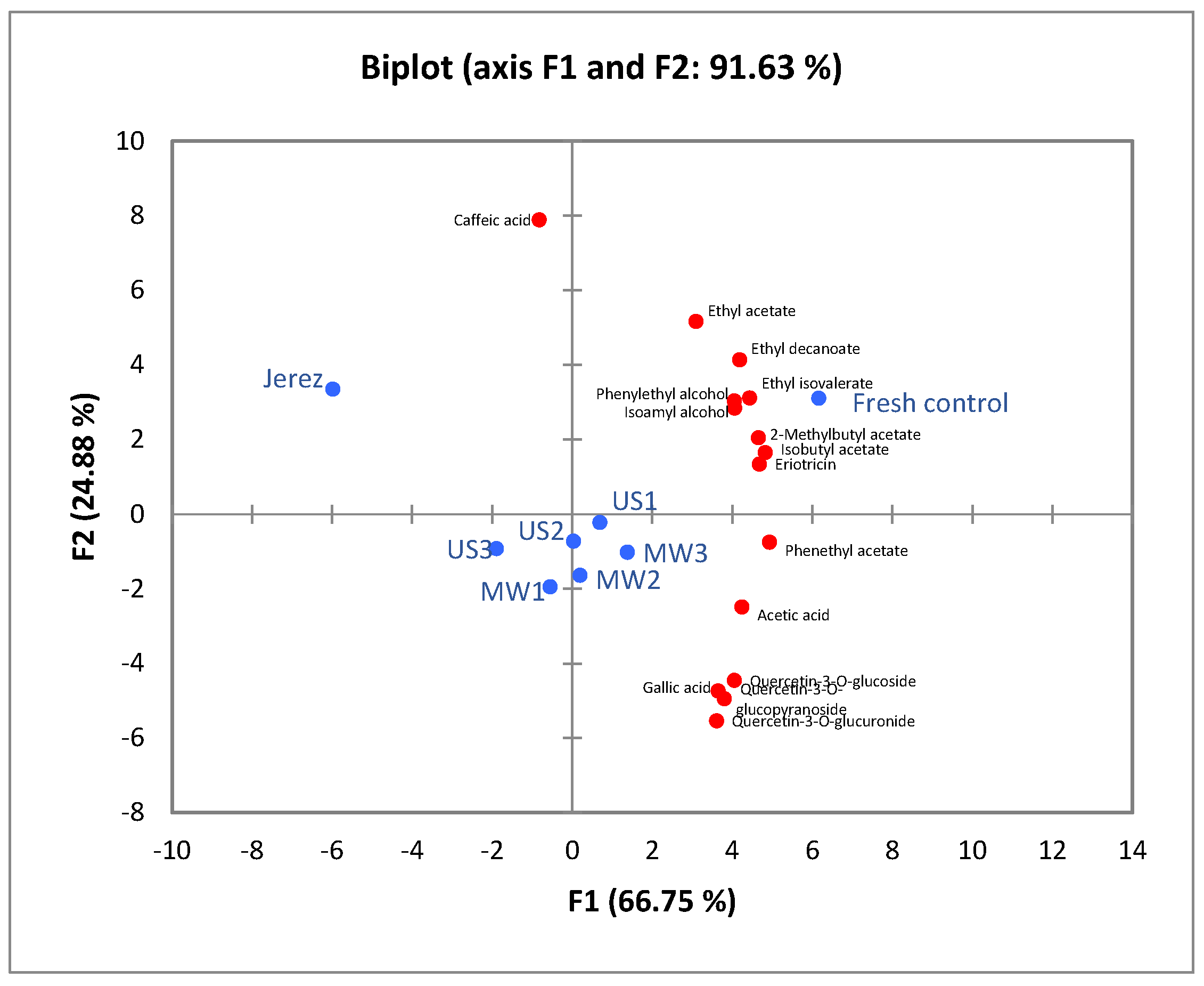 - Sánchez-Córdoba, C.; Durán-Guerrero, E.; Castro, R. Olfactometric and sensory evaluation of red wines subjected to ultrasound or microwaves during their maceration or ageing stages. LWT 2021, 144, 111228. [Google Scholar] [CrossRef]
