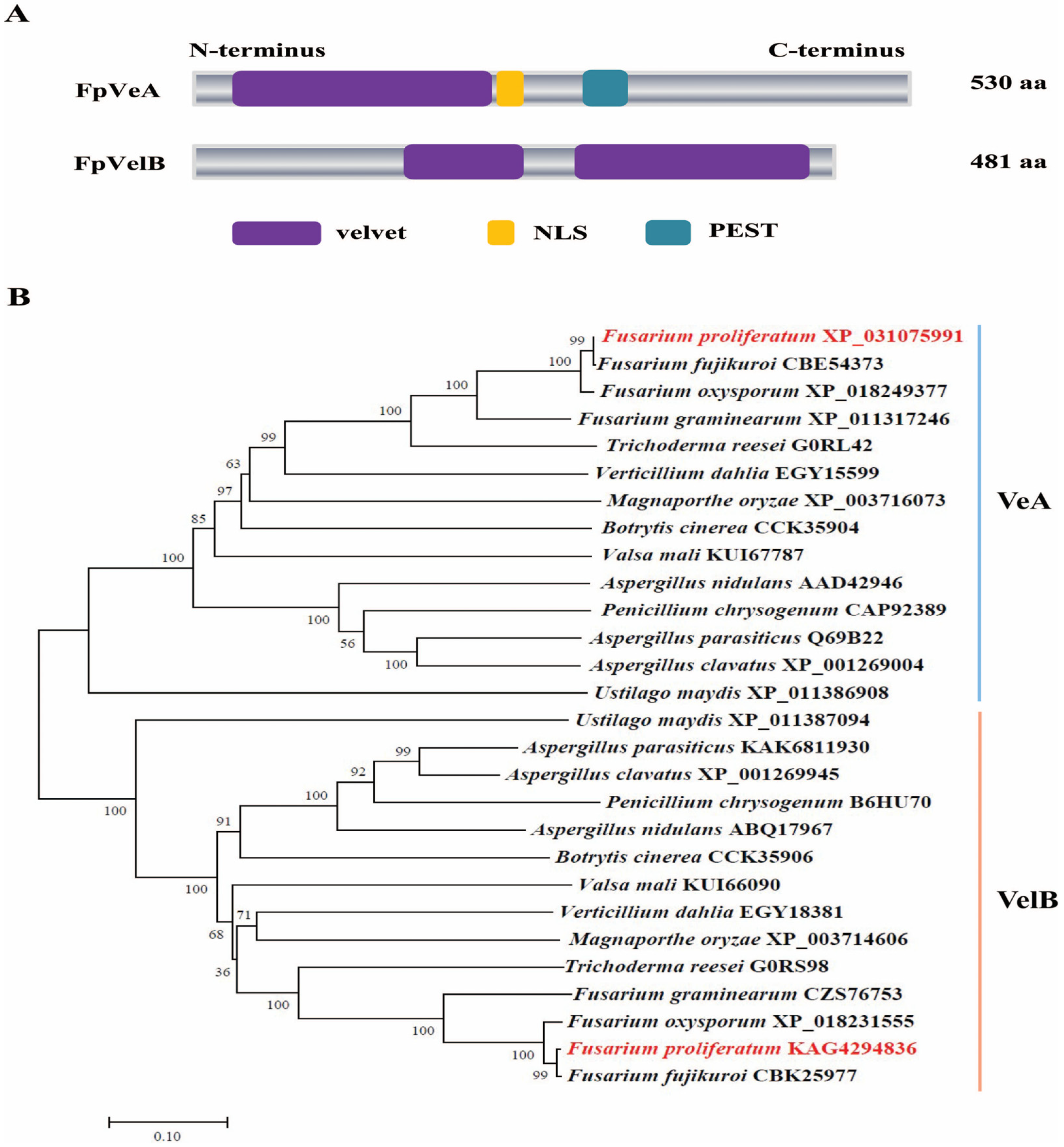 Figure 1. Structure features and phylogenetic analysis of FpVeA and FpVelB proteins. (A) Domain architecture of FpVeA and FpVelB in F. proliferatum. NLS, nuclear localization signal. PEST, proline (P) glutamic acid (E) serine (S) and threonine (T) rich sequence. (B) Phylogenetic relationship of VeA (blue line) and VelB (orange line) from F. proliferatum (red) and other different fungal species (black). Phylogenetic tree was constructed by the neighbor-joining method using MEGA12 software. The bootstrap values of 1000 replications are shown at the nodes. The organism names and GenBank accession numbers are indicated on the right of clades. The scale bar represents 0.1 amino acid substitutions per site.