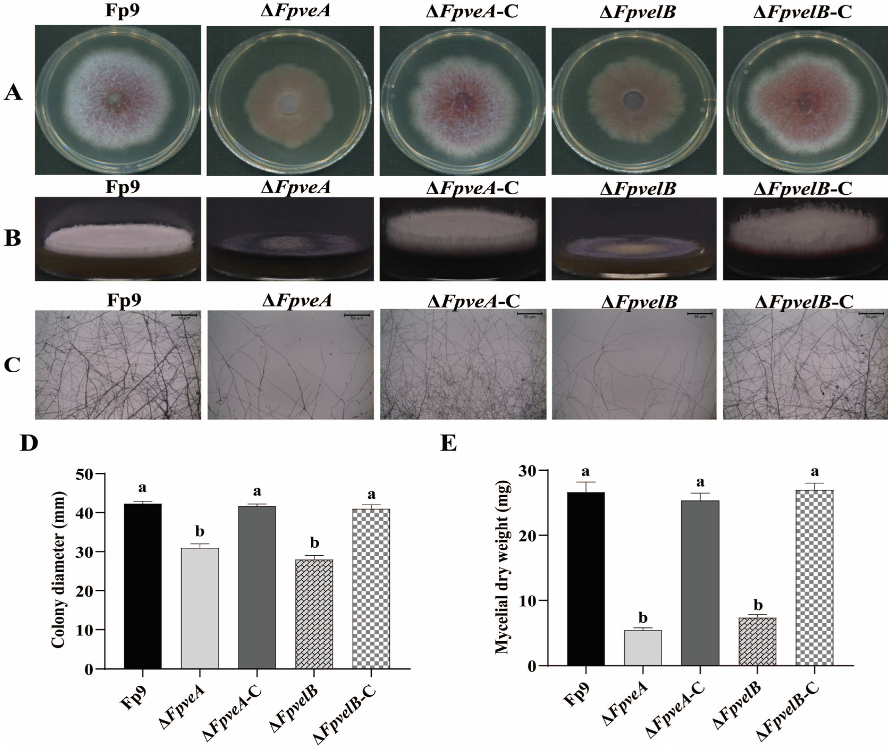 Figure 2. The role of FpVeA and FpVelB on vegetative growth in F. proliferatum. (A) Colony morphologies of ΔFpveA and ΔFpvelB on PDA media at 28 °C for 4 days. (B) The aerial mycelia of ΔFpveA and ΔFpvelB in test tubes containing PDA media at 28 °C for 3 days. (C) Hyphal tips of ΔFpveA and ΔFpvelB on the coverslips. Scale = 50 μm (black line). (D) Colony diameters of ΔFpveA and ΔFpvelB on PDA media at 28 °C for 4 days. (E) Mycelial dry weights of ΔFpveA and ΔFpvelB in PDB media at 28 °C for 5 days. Error bars denote standard deviations of three replicates. Different letters above bars represent significant differences determined using ANOVA with Student’s t-test (p < 0.05). The experiment was repeated three times.