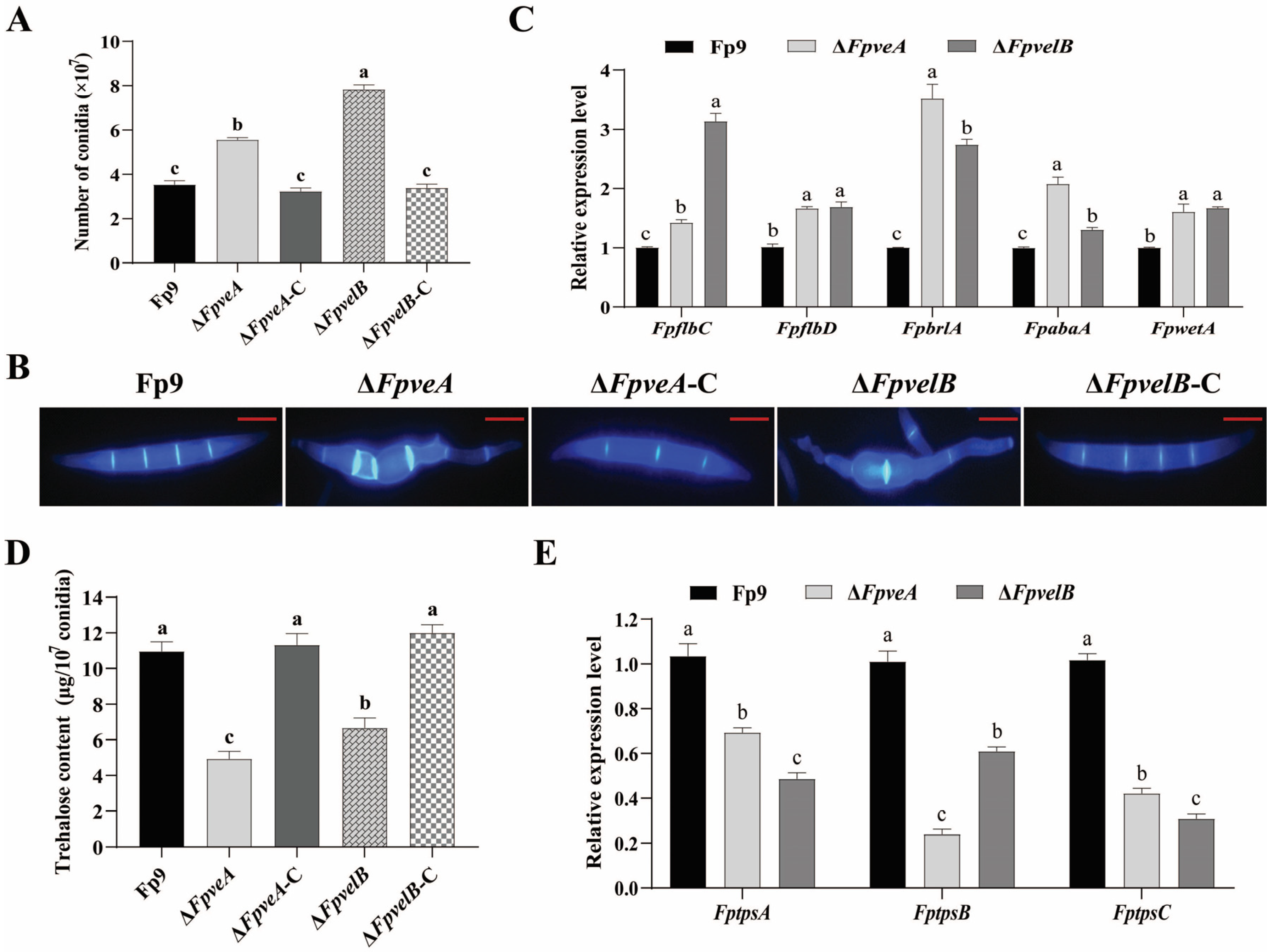 Figure 3. Effect of FpVeA and FpVelB on conidiation in F. proliferatum. (A) Quantification of conidiospores of ΔFpveA and ΔFpvelB. After being cultured in YEPD media at 28 °C for 3 days, the conidia were harvested and counted. (B) Morphology of macroconidia of ΔFpveA and ΔFpvelB. Macroconidia were harvested from mung bean media, stained with 10 μg/mL CFW and photographed under a fluorescence microscope. Scale = 5 μm (red line). (C) Relative expression levels of spore-specific genes in ΔFpveA and ΔFpvelB. After being cultured in YEPD media at 28 °C for 3 days, the conidia were harvested for qRT-PCR. FpflbC encoded C2H2 zinc finger transcription factor, FpflbD encoded Myb-like transcription factor and FpbrlA-, FpabaA- and FpwetA-encoded regulators were involved in the central development pathway. (D) Trehalose contents in the conidia of ΔFpveA and ΔFpvelB. After being cultured in YEPD media at 28 °C for 3 days, the conidia were collected for the measurement of trehalose contents. (E) Relative expression levels of trehalose synthetic genes in ΔFpveA and ΔFpvelB. After being cultured in YEPD media at 28 °C for 3 days, the conidia were harvested for qRT-PCR. FptpsA, FptpsB and FptpsC encoded α,α-trehalose phosphate synthases. Error bars denote standard deviations of three replicates. Different letters above bars represent significant differences determined using ANOVA with Student’s t-test (p < 0.05). Each experiment was performed in triplicate.