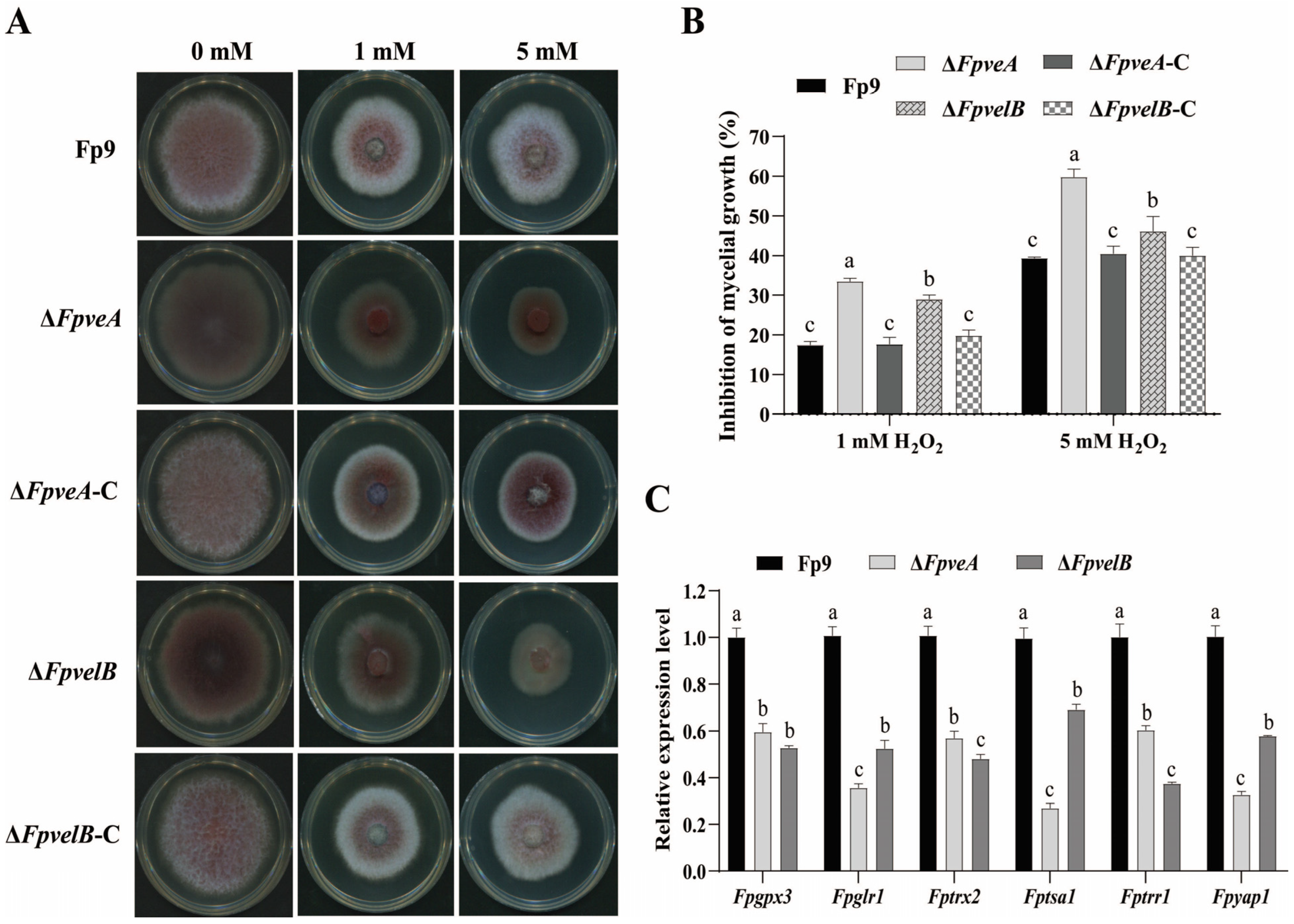 Figure 4. Involvement of FpVeA and FpVelB in the response to oxidative stress. (A) Colonies of ΔFpveA and ΔFpvelB on PDA media supplemented with 1 mM or 5 mM H2O2 at 28 °C for 5 days. (B) Inhibition of mycelial growth of ΔFpveA and ΔFpvelB on PDA media containing different concentrations of H2O2. (C) Relative expression levels of genes involved in glutaredoxin and thioredoxin systems in ΔFpveA and ΔFpvelB. After being cultured in PDB media for 3 days, each strain was transferred into PDB supplemented with 5 mM H2O2 for 45 min and the mycelia were harvested for qRT-PCR. Fpgpx3 encoded glutathione peroxidase, Fpglr1 encoded glutathione reductase, Fptrx2 encoded thioredoxin, Fptsa1 encoded thioredoxin peroxidase, Fptrr1 encoded thioredoxin reductase and Fpyap1 encoded AP1-like transcription factor. Error bars denote standard deviation of three replicates. Different letters above bars represent significant differences determined using ANOVA with Student’s t-test (p < 0.05). All experiments were repeated three times independently.