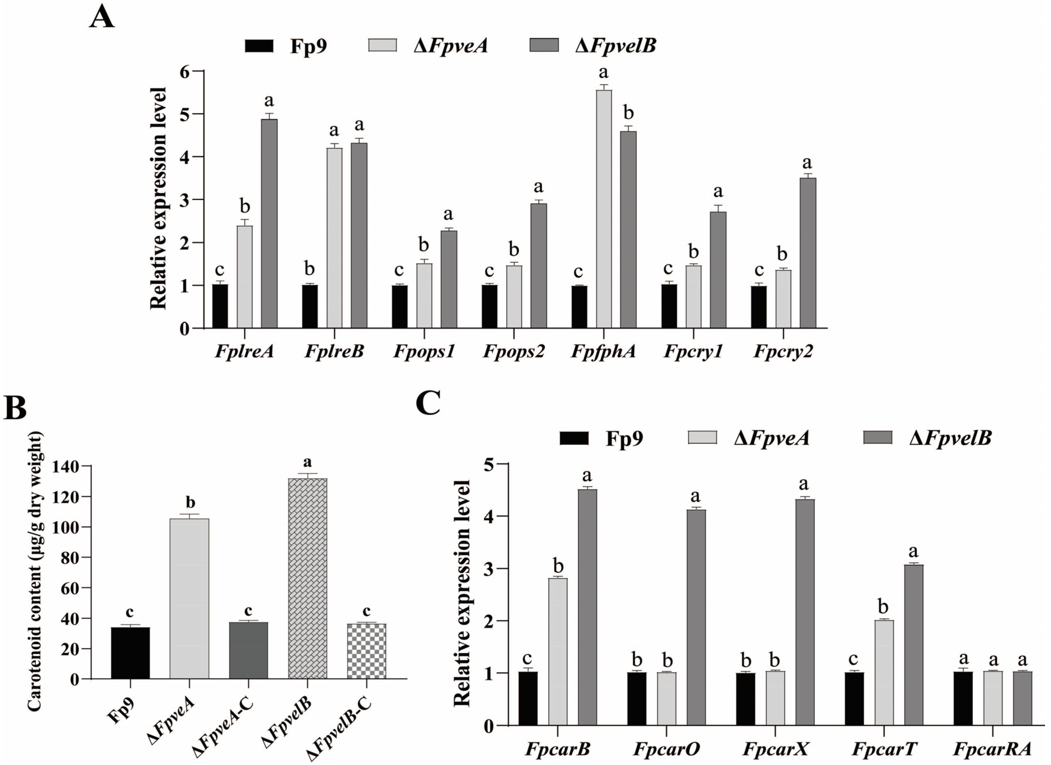 Figure 5. The influence of FpVeA or FpVelB on light perception in F. proliferatum. (A) Relative expression levels of genes encoding photoreceptors in ΔFpveA and ΔFpvelB. After being cultured in PDB under continuous illumination at 28 °C for 3 days, the mycelia were harvested for qRT-PCR. FplreA and FplreB encoded white collar proteins, Fpops1 and Fpops2 encoded opsins, FpfphA encoded phytochrome, and Fpcry1 and Fpcry2 encoded cryptochromes. (B) Carotenoid contents of ΔFpveA and ΔFpvelB in PDB media under continuous illumination at 28 °C for 7 days. (C) Relative expression levels of genes associated with carotenoid synthesis in ΔFpveA and ΔFpvelB. After being cultured in PDB under continuous illumination at 28 °C for 3 days, the mycelia were harvested for qRT-PCR. FpcarB encoded phytoene desaturase, FpcarO encoded opsin-like protein, FpcarX encoded β-carotenoid-cleaving oxygenase, FpcarT encoded torulene-cleaving oxygenase, and FpcarRA encoded phytoene synthase and carotene cyclase. Error bars denote standard deviation of three replicates. Different letters above bars represent significant differences determined using ANOVA with Student’s t-test (p < 0.05). The experiment was repeated three times.
