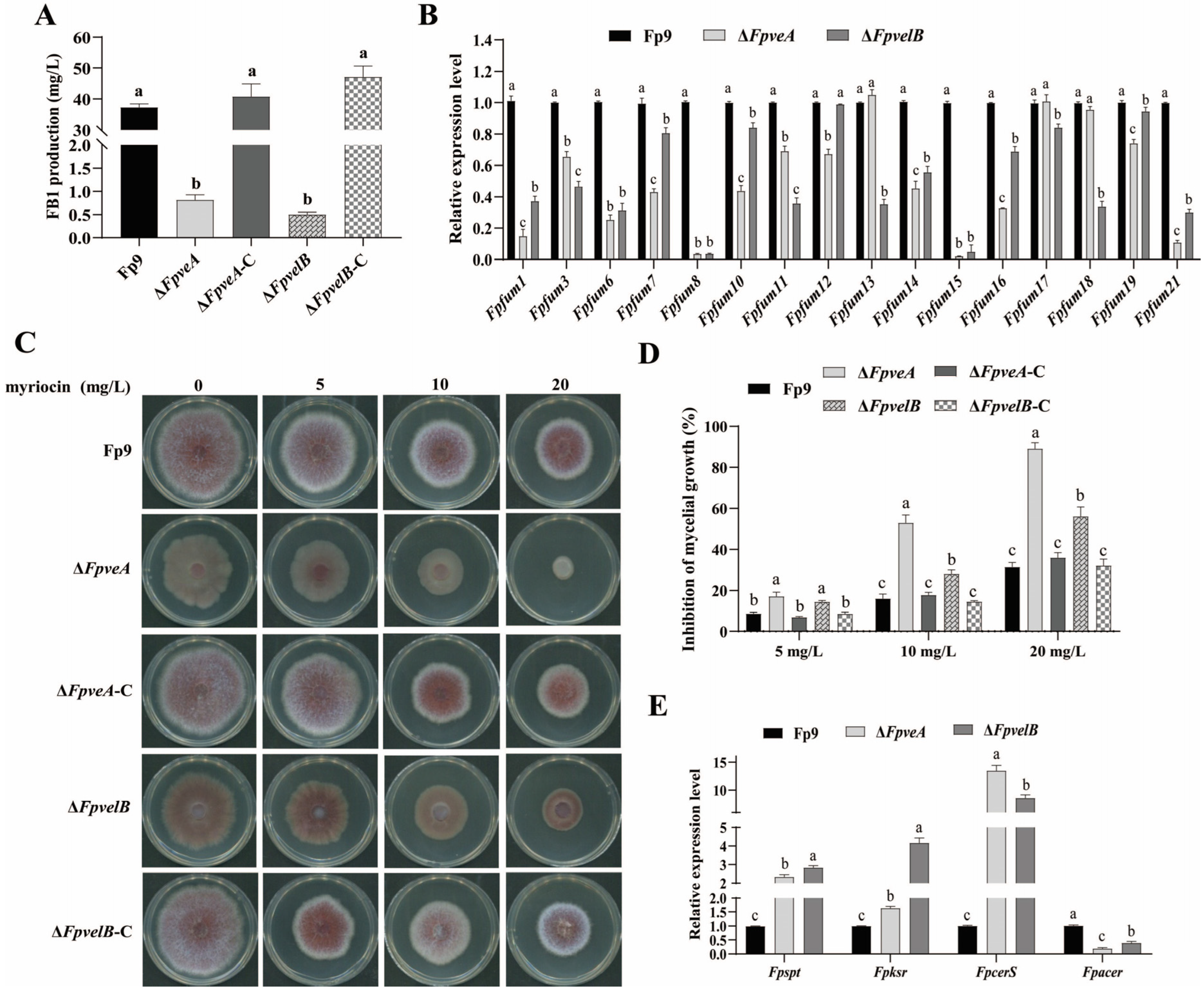 Figure 6. Effect of FpVeA and FpVelB on FB1 production in F. proliferatum. (A) The amounts of FB1 produced by ΔFpveA and ΔFpvelB in PDB media at 28 °C for 9 days. (B) Relative expression levels of fumonisin biosynthetic genes (Fpfums) in ΔFpveA and ΔFpvelB. After being cultured in PDB at 28 °C for 3 days, the mycelia were harvested for qRT-PCR. (C) Colonies of ΔFpveA and ΔFpvelB on PDA media supplemented with 5, 10 or 20 mg/L myriocin at 28 °C for 4 days. (D) Inhibition of mycelial growth of ΔFpveA and ΔFpvelB under different concentrations of myriocin. (E) Relative expression levels of genes responsible for sphingolipid biosynthesis in ΔFpveA and ΔFpvelB. After being cultured in PDB at 28 °C for 3 days, the mycelia were harvested for qRT-PCR. Fpspt encoded serine palmitoyltransferase, Fpksr encoded 3-ketosphonganine reductase, FpcerS encoded ceramide synthase and Fpacer encoded alkaline ceramidase. Error bars denote standard deviations of three replicates. Different letters above bars represent significant differences determined using ANOVA with Student’s t-test (p < 0.05). Each experiment was carried out with three replicates.