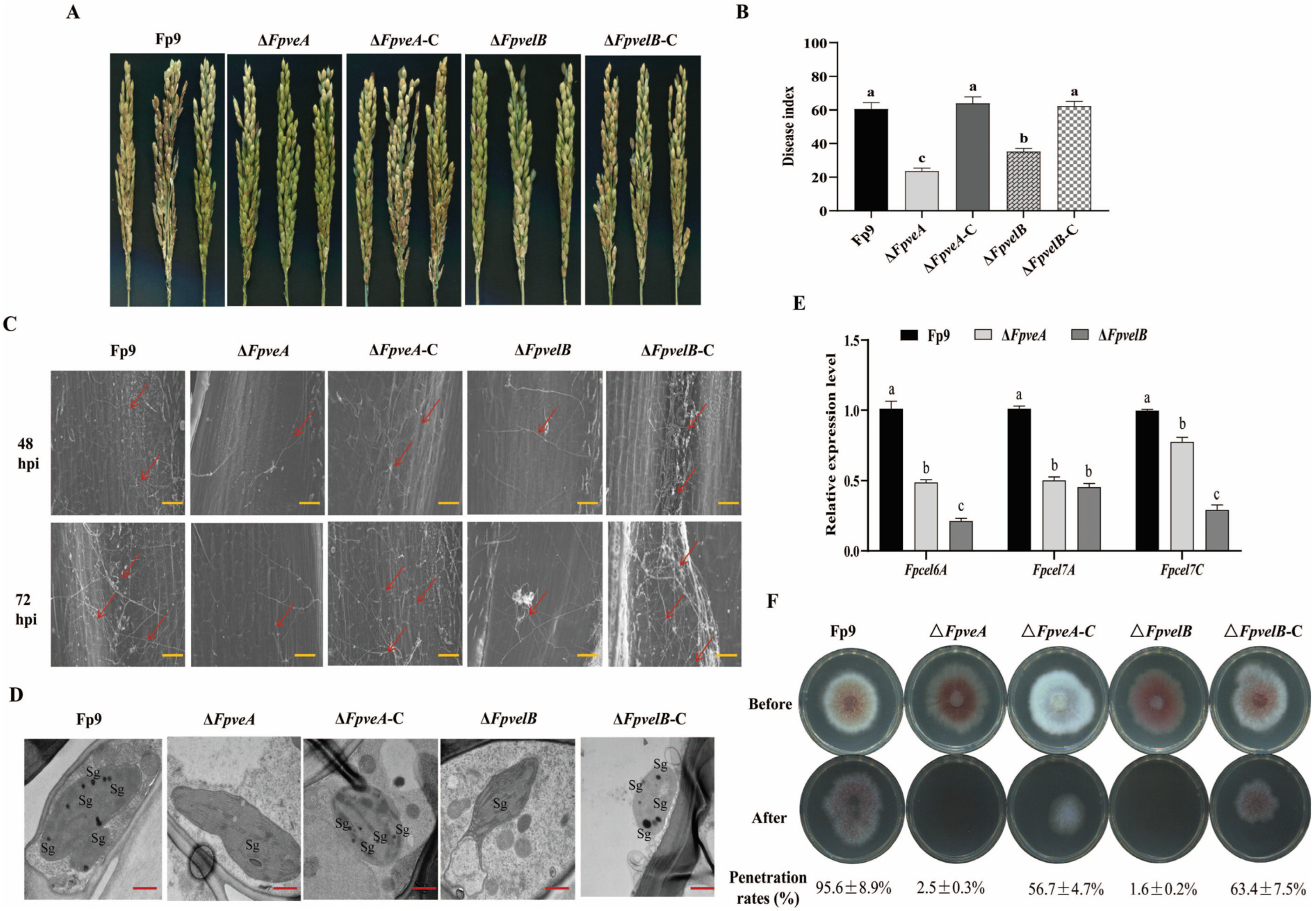 Figure 7. The role of FpVeA and FpVelB on the virulence of F. proliferatum. (A) Disease symptoms of rice spikelets caused by ΔFpveA and ΔFpvelB at 21 days post-inoculation (dpi). (B) Disease indexes of infected spikelets inoculated with ΔFpveA and ΔFpvelB. The disease severity of rice spikelets were evaluated at 21 dpi. (C) Invasive hyphae of ΔFpveA and ΔFpvelB on rice glumes at 48 hpi and 72 hpi. Invasive hyphae were observed under scanning electron microscopy. The red arrows indicate invasive hyphae. Scale = 100 μm (orange line). (D) Ultrastructure of infected glumes challenged by ΔFpveA and ΔFpvelB at 72 hpi. Rice glumes were observed under transmission electron microscopy. Sg indicates starch grains in the chloroplasts. Scale = 500 nm (red line). (E) Relative expression levels of cellulase-encoding genes of F. proliferatum in rice glumes inoculated with ΔFpveA and ΔFpvelB. Fpcel6A, Fpcel7A and Fpcel7C encoded cellulases. After being incubated for 72 h, the rice glumes were collected for qRT-PCR. (F) The penetration ability of ΔFpveA and ΔFpvelB against cellophane membranes. The strains were grown on PDA media overlaid with a layer of cellophane at 28 °C for 3 days (Before). After removal of the cellophane with the fungal colonies, the plates were incubated for another 3 days (After) to examine the penetration rates (%). Error bars denote standard deviations of three replicates. Different letters above bars represent significant differences determined using ANOVA with Student’s t-test (p < 0.05). The experiment was performed with three biological replicates.