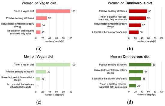 A statistically significant relationship was confirmed between the declared diet and the analysed factors influencing the choice of plant-based beverages. In contrast, statistical analysis (chi-square test of independence) did not prove a relationship between gender (r = 0.695) and the indicated factors. Based on the obtained research results (Figure 1b), it was found that among women on a diet who declared consumption of both plant and animal products (“omnivorous diet”), the main reasons for consuming plant-based beverages were the positive sensory characteristics of these products (56%) and the use of a diet that lowers saturated fatty acids intake (52%). Research by Madeira et al. confirmed that health benefits and sensory attributes are the primary motivations for consuming plant-based beverages [21]. Thirty-seven percent of women declaring this type of diet indicated lactose intolerance, and 30% of women indicated a dislike of cow’s milk. According to the results obtained from women on a vegan diet (Figure 1a), it was confirmed that 100% of this group attributed their diet as the primary reason for consuming these products. It should be noted that of these individuals, only 32% additionally declared choosing this group of products due to their positive sensory characteristics, 14% due to the indicated lactose intolerance, and 13% use of a diet lowering saturated fatty acids (SFA) intake. However, according to Zaremba et al. [22], 100% of the vegans surveyed also mentioned animal welfare. Other studies also confirm this aspect [23]. Among men with an omnivorous diet, 69% declared their positive sensory characteristics as the main reason for consuming this group of products (Figure 1d). Forty-four percent indicated lactose intolerance, and 38% of men in this group indicated a dislike of cow’s milk, while 22% indicated a diet lowering SFA intake. Analysis of the obtained results confirmed that 100% of the surveyed men who declared a vegan diet indicated that the type of diet was the main reason for consuming this group of products (Figure 1c). Thirty percent of this group confirmed positive sensory characteristics, and 13% confirmed lactose intolerance or a dairy allergy. Only 1% of men with vegan diets confirmed that the main reasons for consuming plant-based beverages were the limitation of saturated fatty acids. Other studies indicate that digestibility problems and lactose intolerance, or lactase enzyme malabsorption, are the primary reasons consumers cite for consuming plant-based milk [6,24,25]. Similar trends were also confirmed among Portuguese respondents aged 18 to 85 [26]. Similar results were obtained regarding the perception of the health impact of plant-based beverages among the Swiss [27].