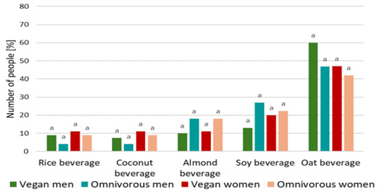 Firstly, 19.5% of respondents on an omnivorous diet confirmed drinking plant-based beverages less than once a month (Table 1). Among respondents who follow an omnivorous diet, 33% confirmed that they do not consume this group of products (51% of men and 15% of women). Only 6% of people (women) following a vegan diet confirmed consuming this group of products less than once a month. The statistical analysis (chi-square test of independence) did not prove a relationship between gender (r = 0.385) and the frequency of consumption of plant-based beverages.
