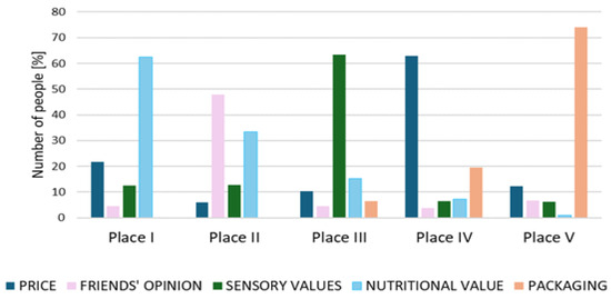 In analysing the factors determining the choice of plant-based beverages, a ranking method (five-point scale, I place the most important factor, V place the least important factor) was used for the following responses: price, ingredients, friends’ opinions, sensory qualities, packaging, and others. An open-ended question, “other,” was used to allow for the possibility of identifying other decisive factors when choosing products from this group.
