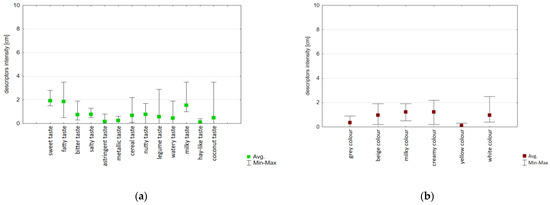 The sensory profiling defined and determined the perception of colour and taste descriptors (Figure 5a,b, Table S2). The analysis confirmed six descriptors for colour (grey, beige, milky, creamy, yellow, and white), 13 for taste (sweet, fatty, bitter, salty, astringent, metallic, cereal, nutty, legume, watery, milky, hay-like, and coconut).