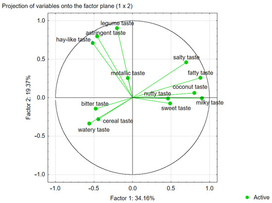 PCA was also used to map the variants tested in our experiment (i.e., samples with analysed plant-based beverages) into these factors. The PCA confirmed that the first two factors (F1 and F2) were the most important elements explaining variation in the data. They explained approximately 52% of the total variance for taste. Therefore, they were selected for data interpretation. The absolute values of factor coordinates for variables indicate the relationship between the factors and the sensory attributes of the analysed beverages (Table 4). For the taste attributes of analysed products, F1 was most strongly related to the taste of milky (r = 0.902), fatty (r = 0.881), coconut (r = 0.812), salty (r = 0.697), and F2 to the taste of legume (r = 0.928), astringent (r = 0.791), and hay-like (r = 0.710).