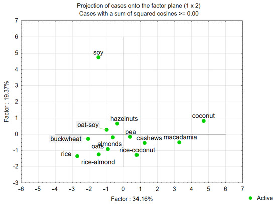 Map of the variants of plant-based beverages as an alternative to milk into factors (F1 × F2). Case–factor coordinate plots based on the attributes of taste profiles (PCA analysis).