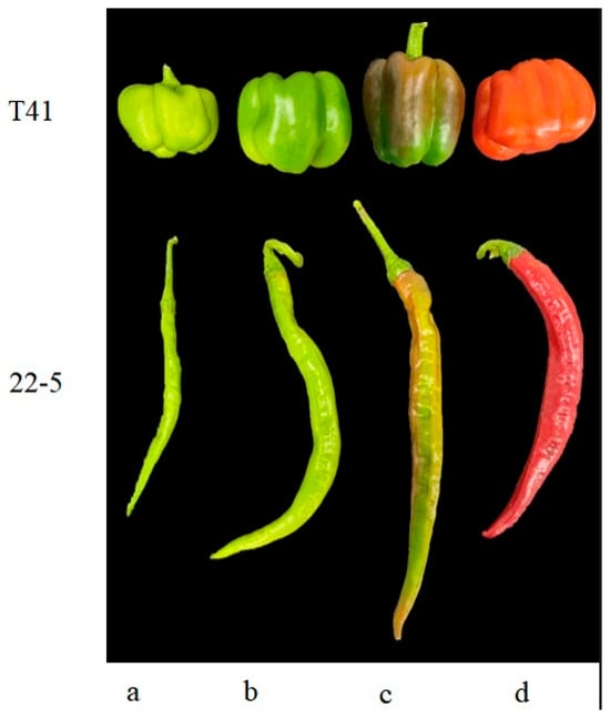 The peppers used in the experiment were germplasm resources collected, identified, and selected by researchers from the Hebei Academy of Agricultural and Forestry Sciences. T41 is a sweet pepper and 22-5 is a chili pepper. The peppers were sown on 8 January 2023, using 72-hole plug trays for seedling cultivation. They were transplanted to a plastic greenhouse in the Modern Agricultural Experimental Garden of the Hebei Academy of Agricultural and Forestry Sciences on 27 March. The growth environment and management level were consistent.