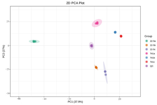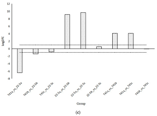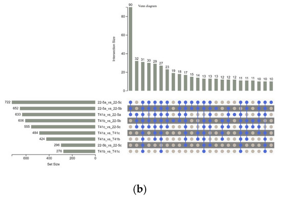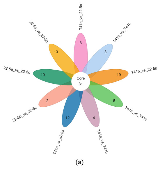 Furthermore, Venn diagram analysis revealed that 31 common DEMs were shared across the nine groups (Figure 5a). Additionally, there were 90 common DEMs among three groups, including 22-5a vs. 22-5b, 22-5a vs. 22-5c, and T41a vs. 22-5a, while other groups shared 10 to 32 DEMs (Figure 5b).